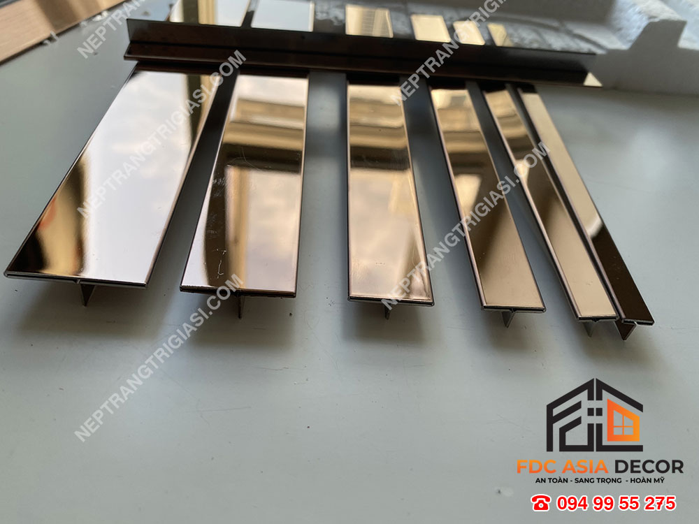 - Chất liệu: inox 304 nguyên chất 100%, bề mặt Nẹp inox T8 được mạ PVD sáng bóng